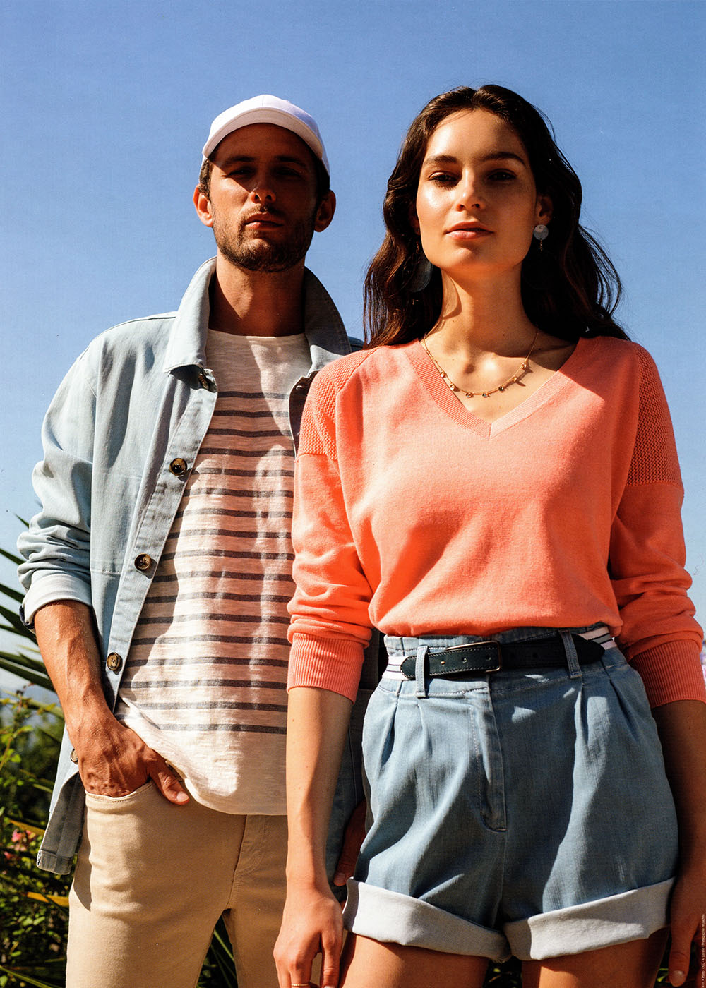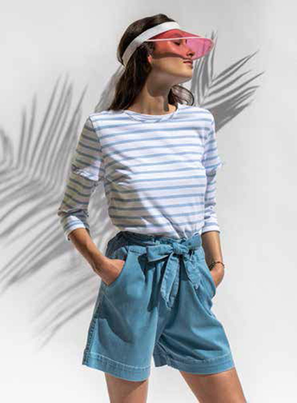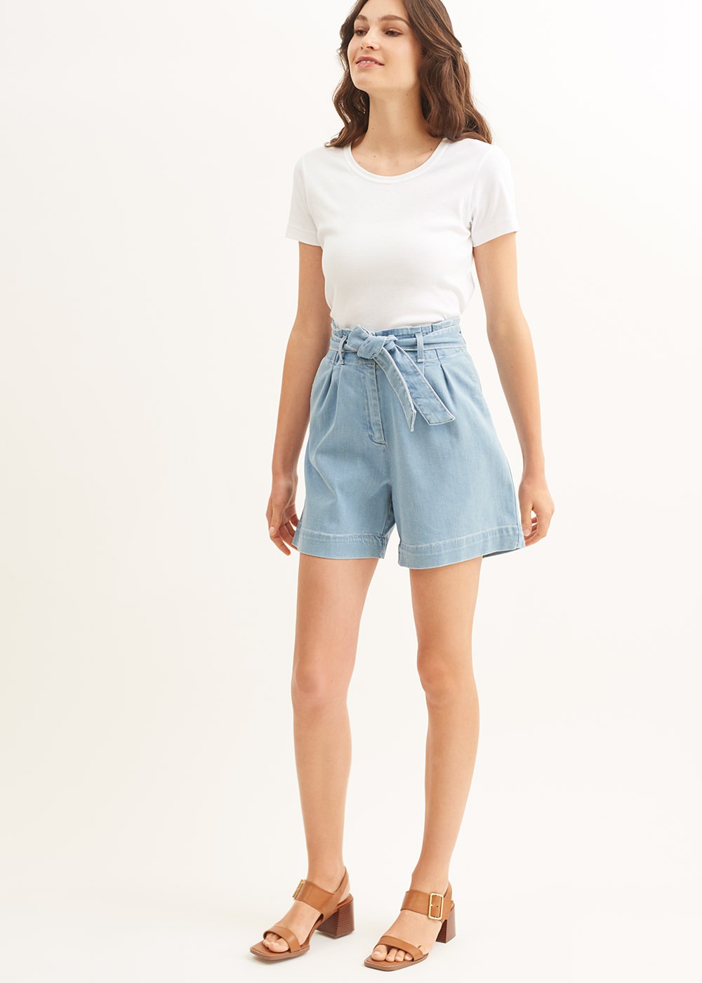 Bermuda für Damen mit leicht ausgestellt geschnittenem Bein, Bundfalten und Stoffgürtel, schrägen Eingriffstaschen und Paspeltaschen hinten, aus angenehm weichem gebleichtem Jeansstoff. Bequemer Schnitt, high waist. Farbe: Bleached denim
