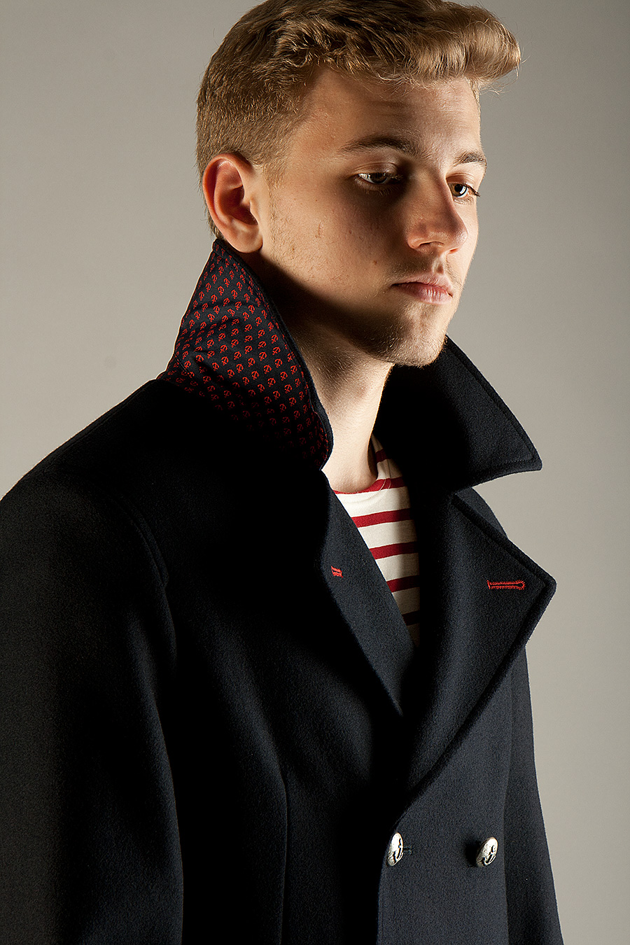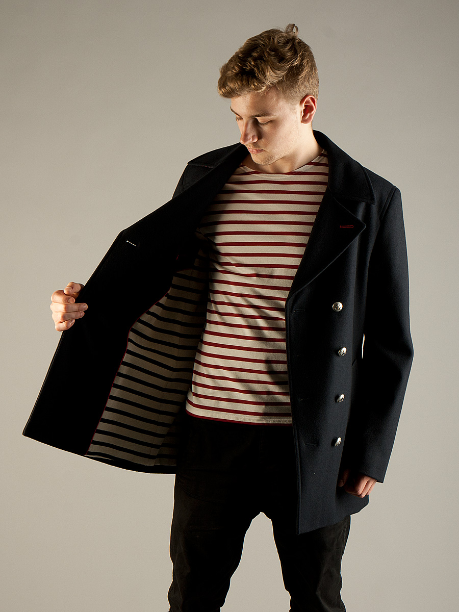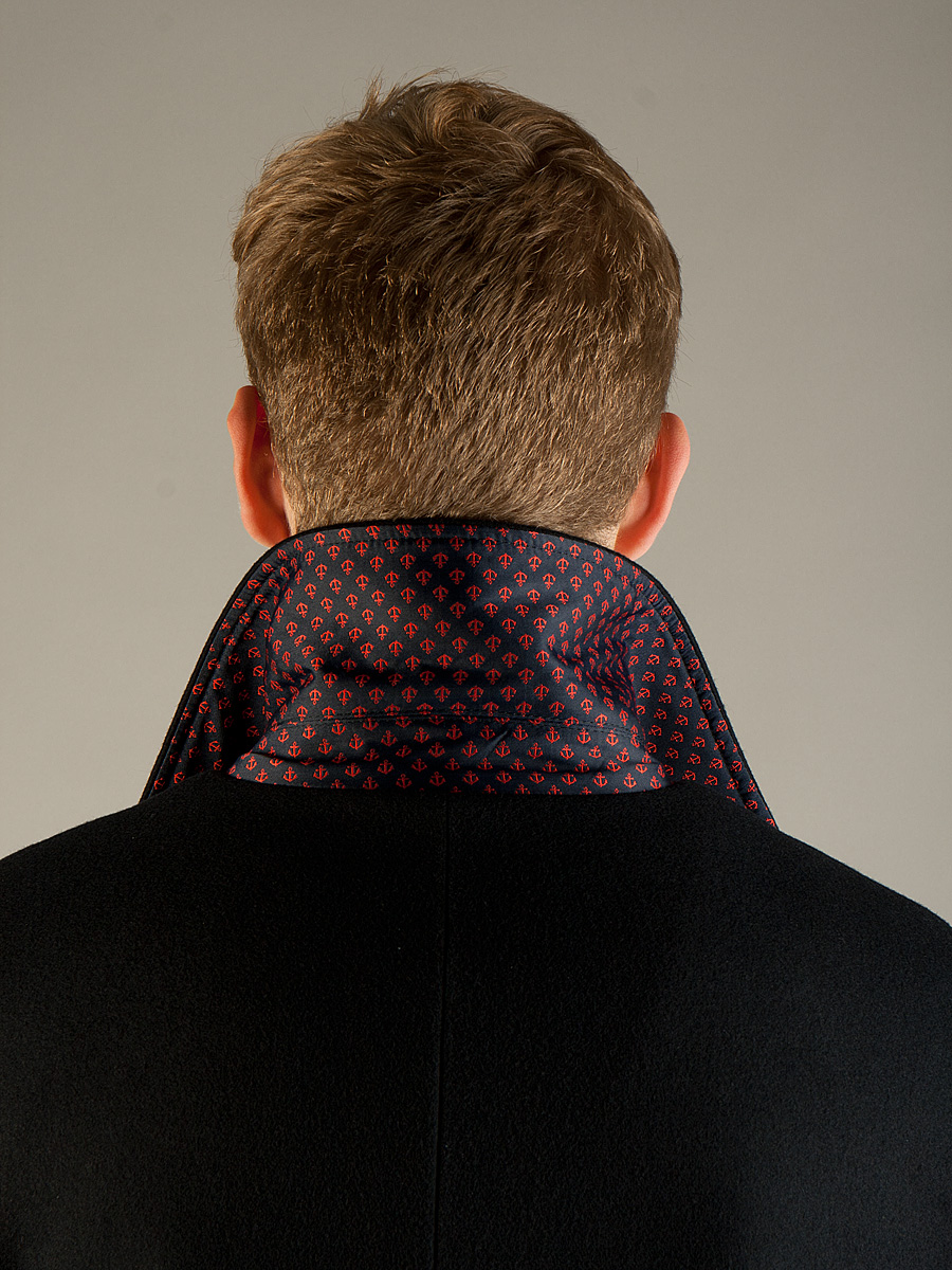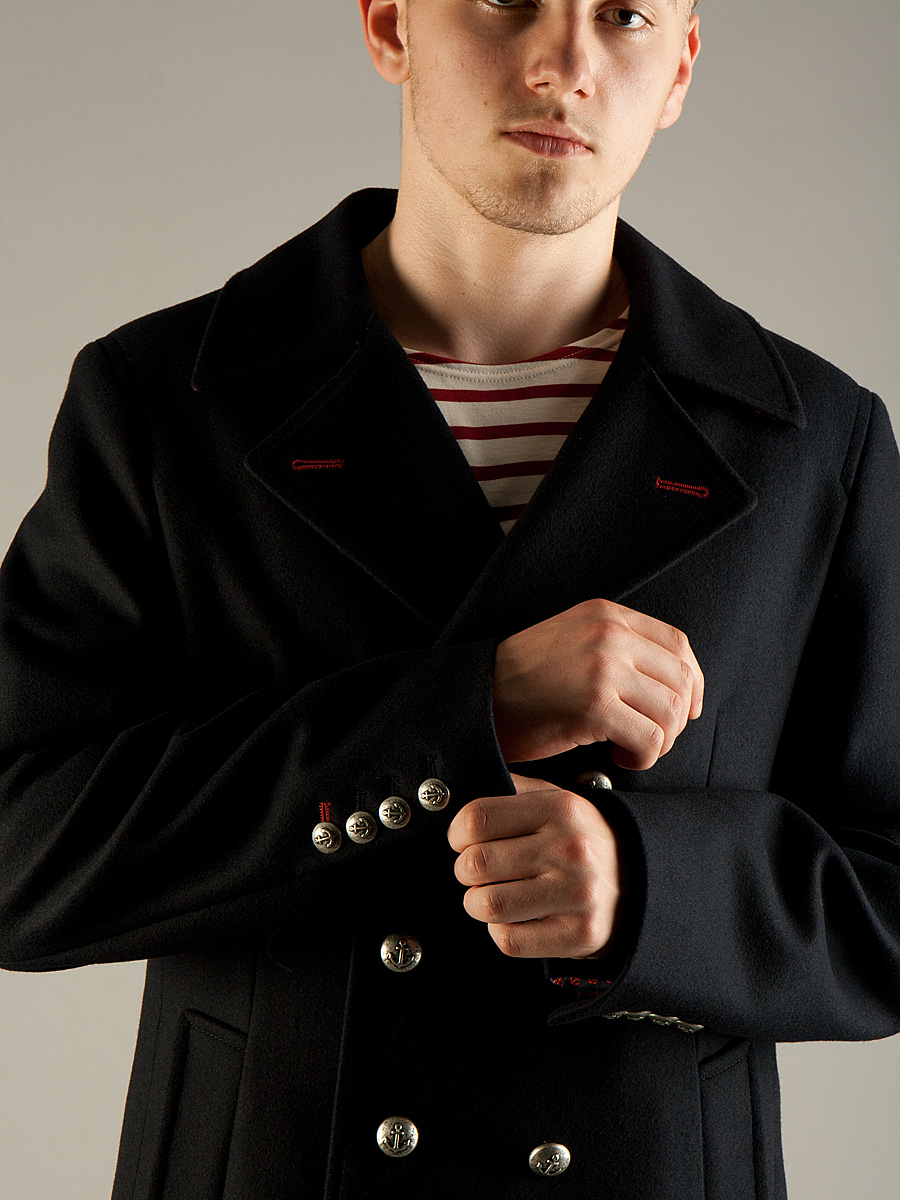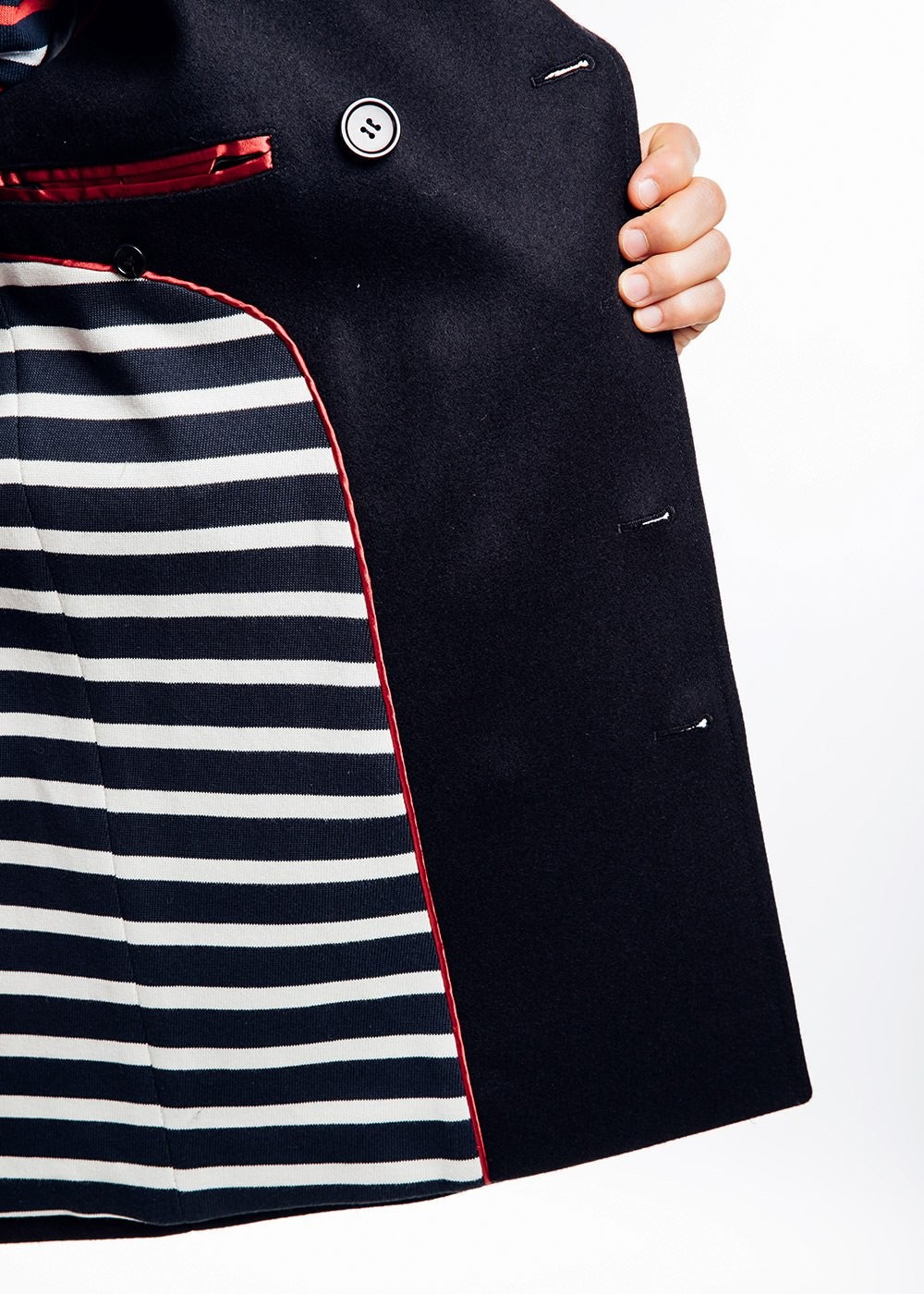 Doppelreihig geknöpfte, schicke, leicht taillierte Cabanjacke für kühlere Tage mit Reverskragen und silbernen Vintage-Knöpfen mit Ankergravur. Rote Farbkontraste an Kragen–Knopflöcher. Kragenunterseite aus gepunktetem Krawattenstoff. Jackenfutter ist aus gestreiftem Baumwollstoff. Die Jacke hat hat einen Schlitz hinten, aussen Leistentaschen und innen Paspeltaschen mit Knopfverschluss. Farbe: Navyblau