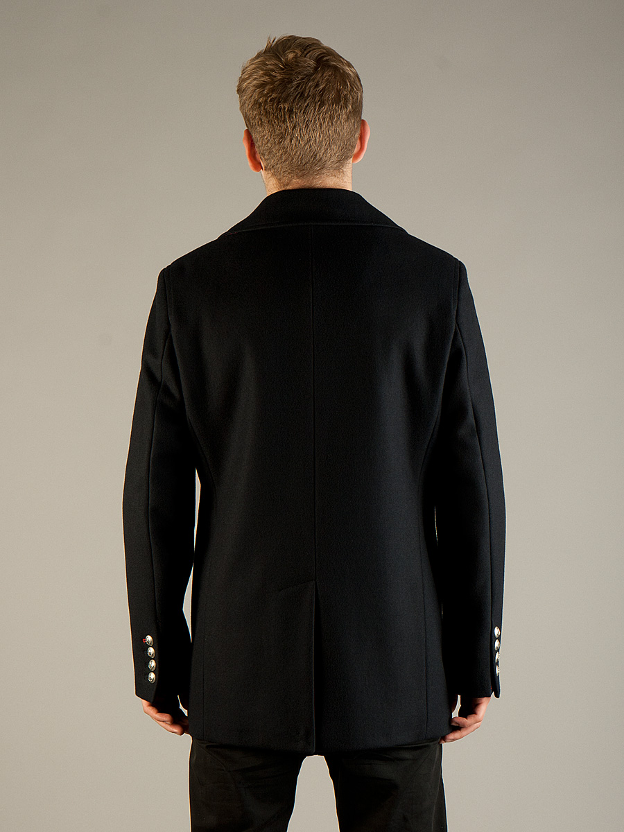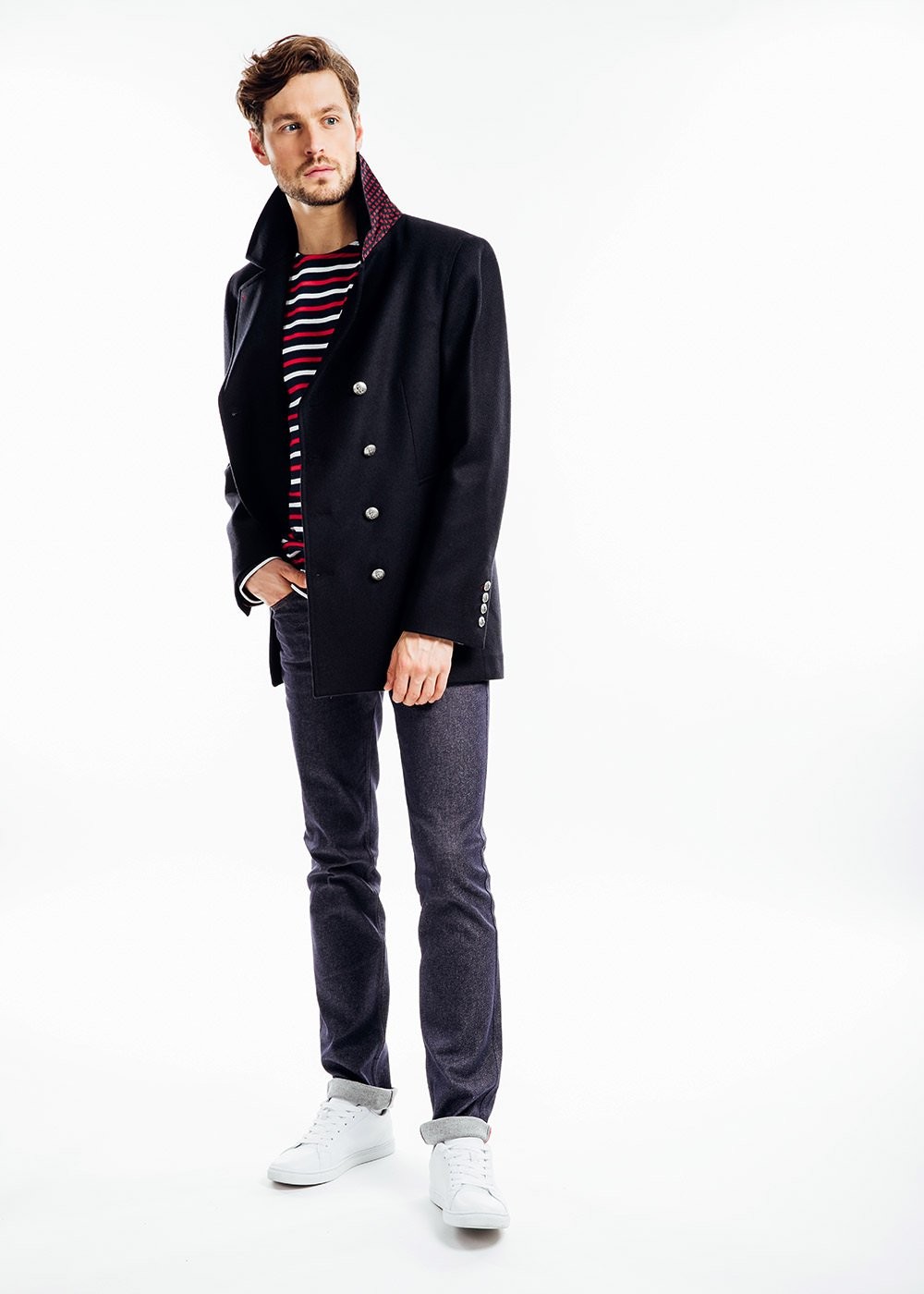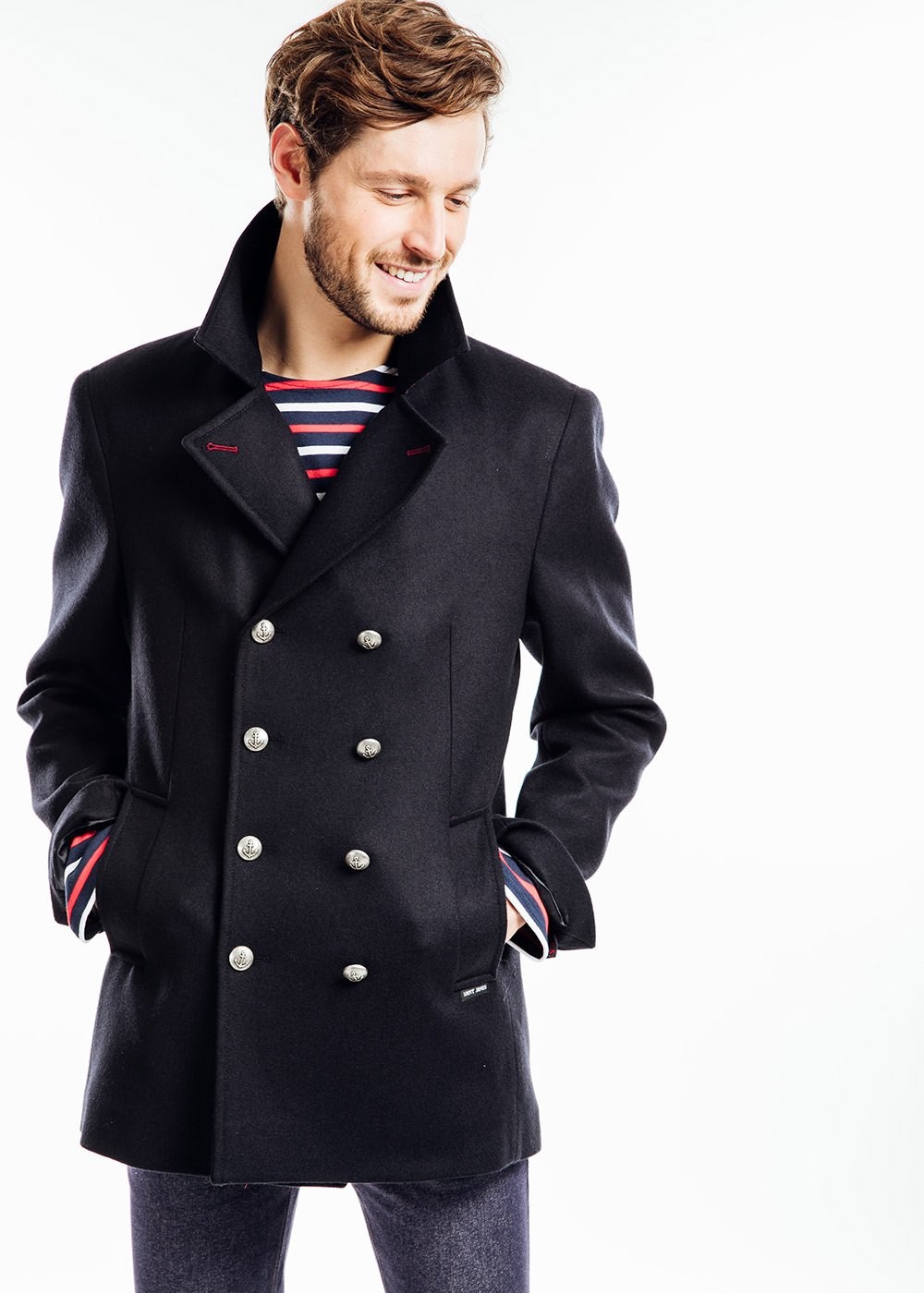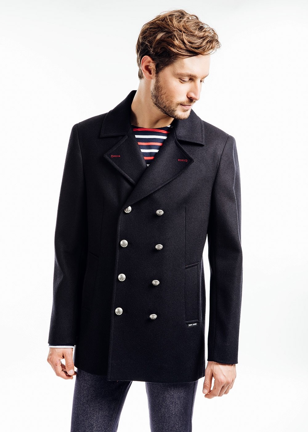 Doppelreihig geknöpfte, schicke, leicht taillierte Cabanjacke für kühlere Tage mit Reverskragen und silbernen Vintage-Knöpfen mit Ankergravur. Rote Farbkontraste an Kragen–Knopflöcher. Kragenunterseite aus gepunktetem Krawattenstoff. Jackenfutter ist aus gestreiftem Baumwollstoff. Die Jacke hat hat einen Schlitz hinten, aussen Leistentaschen und innen Paspeltaschen mit Knopfverschluss. Farbe: Navyblau