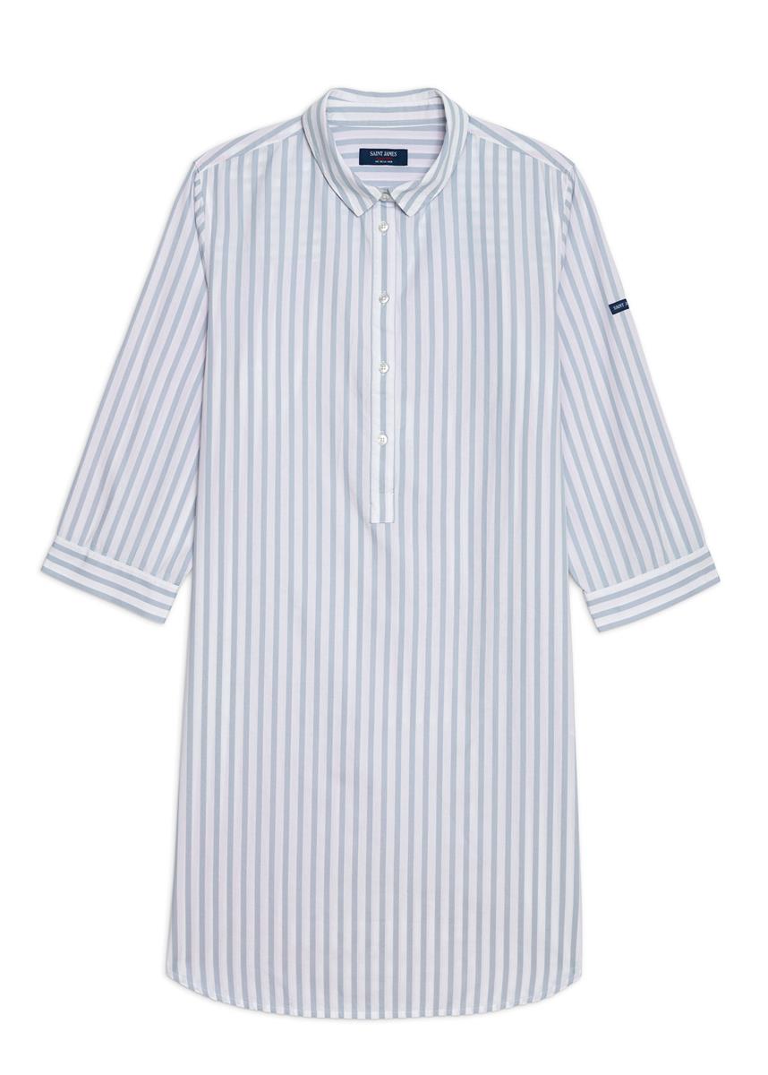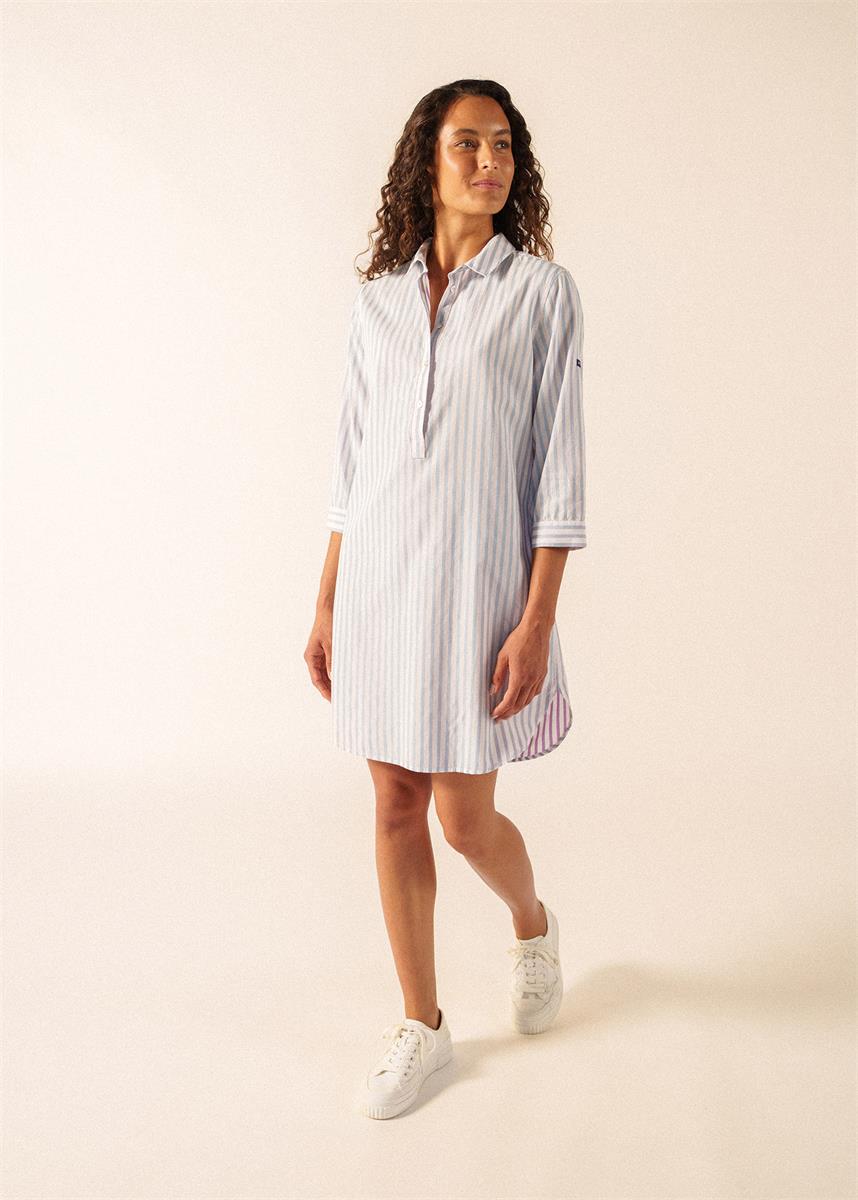 Neuauflage des beliebten Hemdblusenkleid BENEDICTE aus edlem doppelseitigem Hemdenstoff aus Baumwolle. Die Streifen sind innen farblich kontrastierend was sich sehr hübsch zeigt, wenn die Ärmel hochgekrempelt werden. Das leichte Kleid hat eine Knopfleiste bis zur Taille und Manschetten am 3/4-langen Ärmel. Gerader Schnitt. Trägt sich auch gut mit einem Gürtel, sowie als lange Bluse mit Hose oder Leggins. Farbe: Graublau/Weiss/Rosa