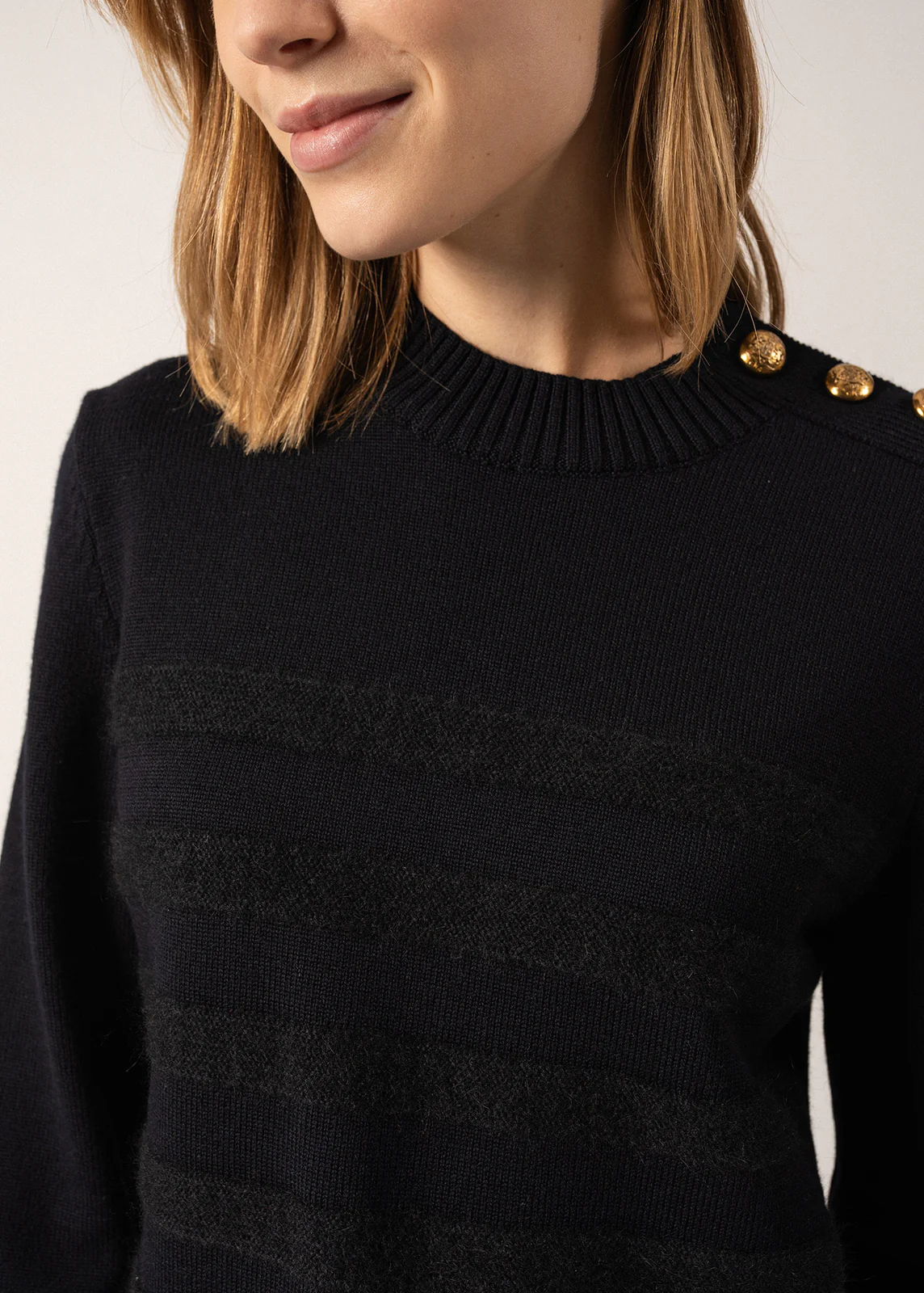 Vom Marinepullover inspirierter, sehr edler Pullover für Damen aus feiner Wolle, angenehm wärmend, mit hochgeschlossenem Kragen, auf einer Schulter geknöpft (bombierte Goldknöpfe mit Ankermotiv). Der Pullover besitzt ein Streifenmuster, Ton in Ton, welches reliefartig, mit weichem, flauschigem Garn eingestrickt wurde. Er hat breite Rippenbund-Abschlüsse an Kragen, Ärmel und Saum, ist bequem und nicht enganliegend geschnitten. Limited Edition!